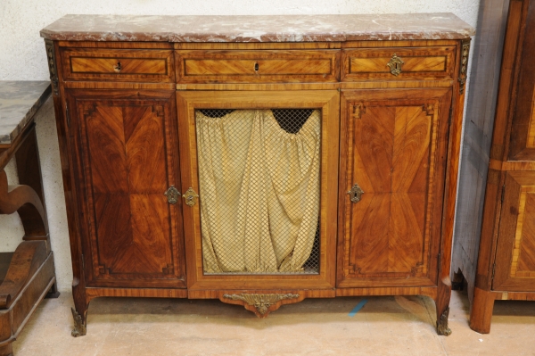 ENFILADE à hauteur d'appui en bois de placage et filets de bois foncé, léger ressaut central. Elle ouvre par trois tiroirs en ceinture et trois vantaux dont celui du centre grillagé. Les montants à pans coupés et ornementations de bronze. Les pieds légèrement cambrés à sabots. Le cul-de-lampe à décor d'un ruban fleuri. Dessus de marbre rouge de Bourgogne.