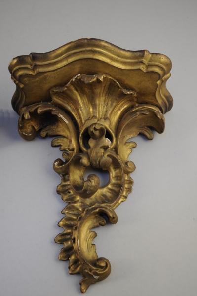 PAIRE de CONSOLES en bois sculpté et doré à décor ajouré d'acanthes et coquilles stylisées.