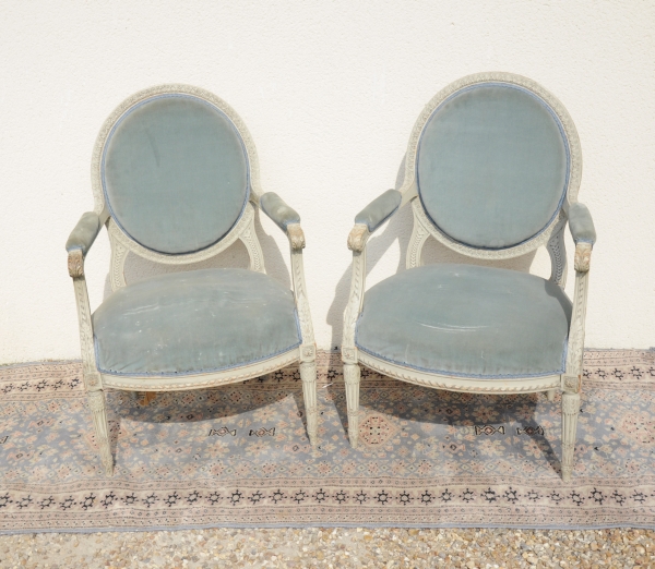 PAIRE de FAUTEUILS à médaillon en bois mouluré, sculpté et peint gris clair. Décor d'acanthes, rubans et rangs de piastres, reposant sur des pieds fuselés, cannelés et rudentés à perles.