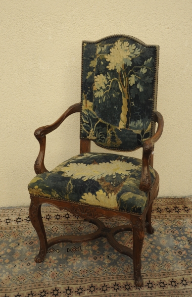 Suite de SIX FAUTEUILS en chêne mouluré et sculpté, à décor de feuilles d'acanthe, coquilles et entrelacs. Le dossier droit en anse de panier, les pieds cambrés à enroulements réunis par une entretoise en 'X'. Garniture de tapisserie ancienne d' Aubusson.