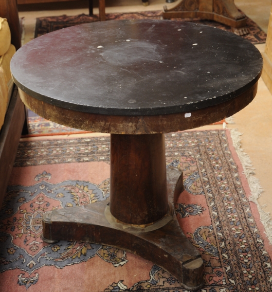 GUÉRIDON circulaire en placage d'acajou, le fût cylindrique reposant sur un piètement tripode. Dessus de marbre noir (égrenures).