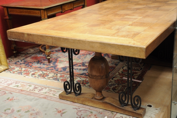 TABLE de SALLE à MANGER en noyer, placage de noyer et fer forgé, le plateau en damier reposant sur un piètement patin à décor d'ove et volutes.
