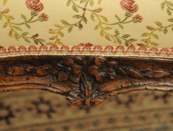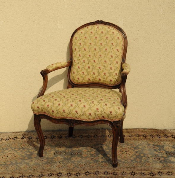 FAUTEUIL à la Reine en bois mouluré et sculpté de fleurettes, le dossier légèrement cintré, repose sur des pieds cambrés.