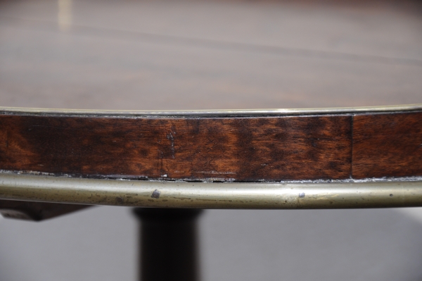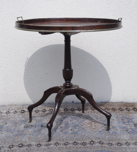 GUÉRIDON en acajou et placage d'acajou moucheté, filets de bois foncé et baguettes de laiton, le plateau basculant à rebord et poignées, le fût de forme balustre reposant sur un piètement quadripode courbé.