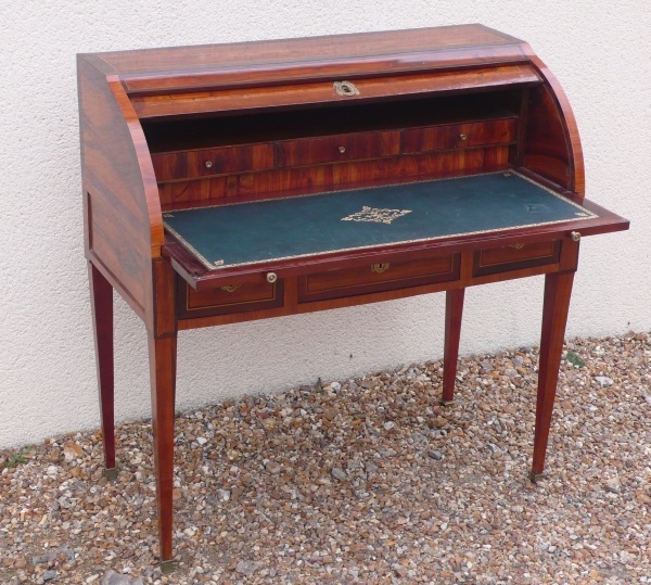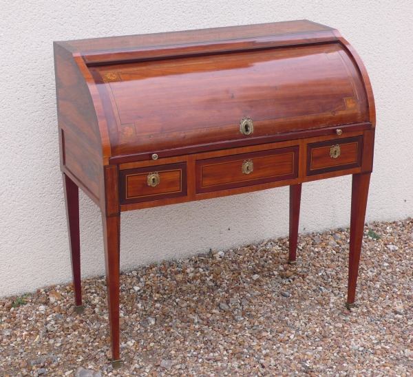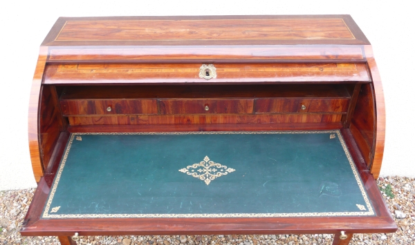 BUREAU à CYLINDRE en placage de bois de rose, de palissandre et filets de bois clair, ouvrant par trois tiroirs en ceinture. La partie supérieure à décor de rosaces découvrant un casier, trois tiroirs et une tablette gainée de cuir. Les agrafes de serrure en laiton de forme ovale à décor de ruban et laurier. Repose sur des pieds fuselés de section carré terminés par des sabots.