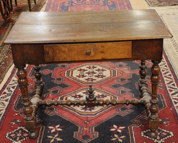 TABLE à écrire en noyer mouluré et tourné ouvrant par un tiroir, les pieds réunis par une entretoise en "H" à décor central d'une bobèche.