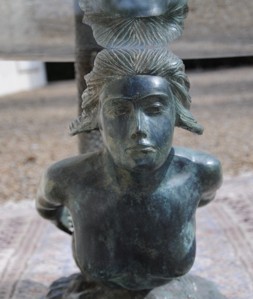 SIRÈNE en bronze patiné formant table basse en bronze patiné. Plateau ovale en verre.