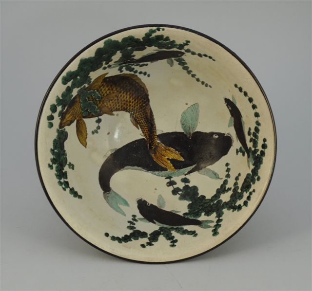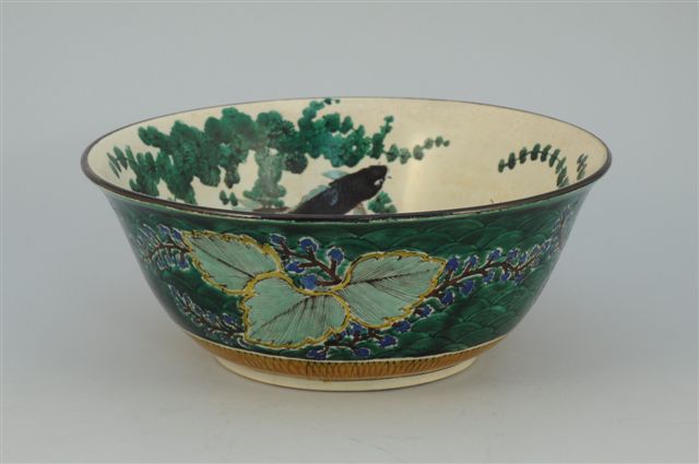 VASQUE en faïence, l'intérieur à décor de carpes "koï" parmi les algues, l'extérieur à décor de paulownia sur fond vert. Au revers de la base la marque Kutani. Japon, fin XIXème. Haut. 12, Diam. 30 cm.