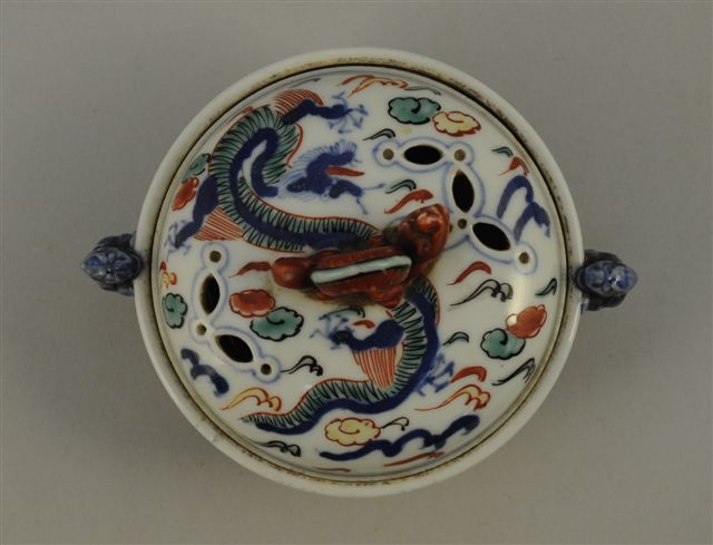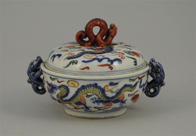 BOUILLON en porcelaine décorée en émaux polychromes de dragons pourchassant la perle sacrée. Au revers, une marque apocryphe de Wanli.