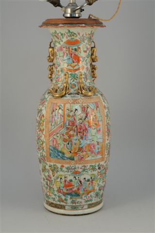 VASE en porcelaine à décor polychrome et or de médaillons de personnages et fleurs. Canton, XIXème.