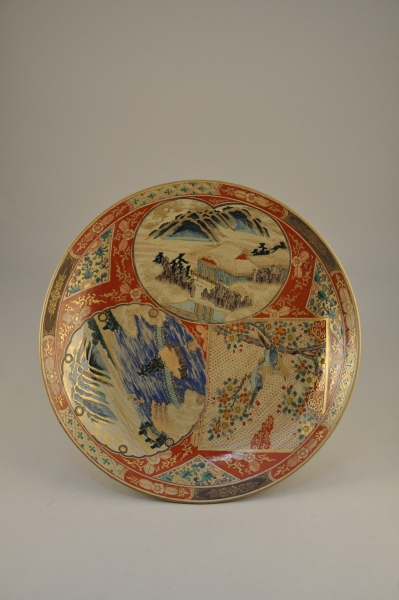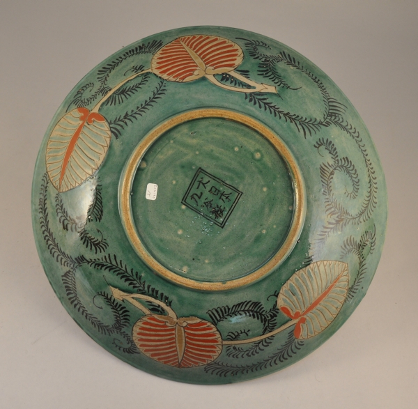 Grand PLAT creux en porcelaine à décor polychrome et doré de montagne, jardin et oiseaux. Le cul vert à décor de feuilles et portant une inscription.