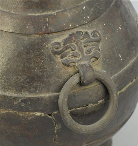 VASE de forme " hu " en bronze à patine brune, deux anses en forme de têtes de chimères supportant des anneaux mobiles.