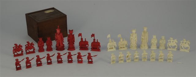 JEUX D'ECHEC en ivoire et ivoire teinté en rouge.