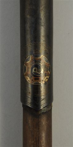 PIPE à opium, garniture métal damasquiné, extrémité en pierre dure (néphrite?). Long. 59 cm.