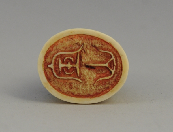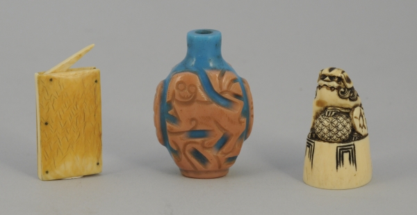 NETSUKE CACHET ovale en ivoire sculpté d'un chien de Fô et TABATIÈRE en ivoire en forme de livre. Haut. respectives: 4,5 et 4 x 2,5 cm.