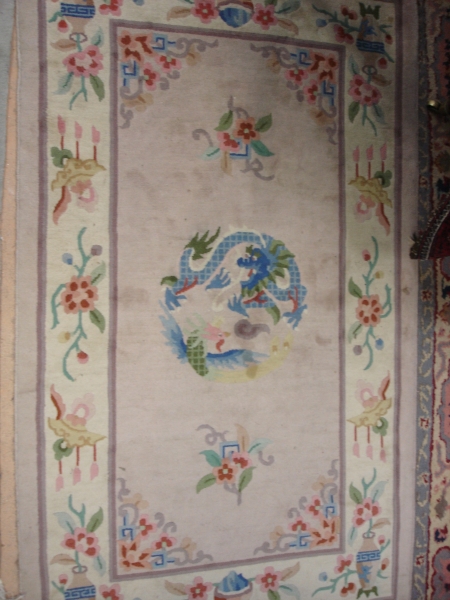 TAPIS de Chine, manufacture de Tien-Tsin, à décor d'un dragon enroulé avec un oiseau, à bordures fleuries. 157 x 90 cm.