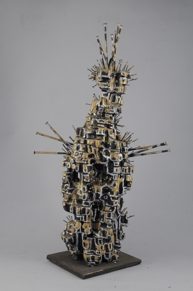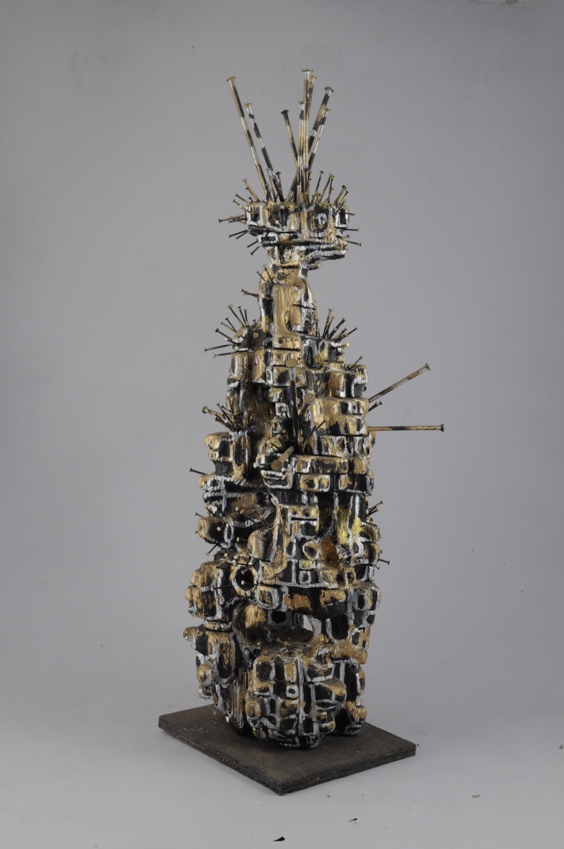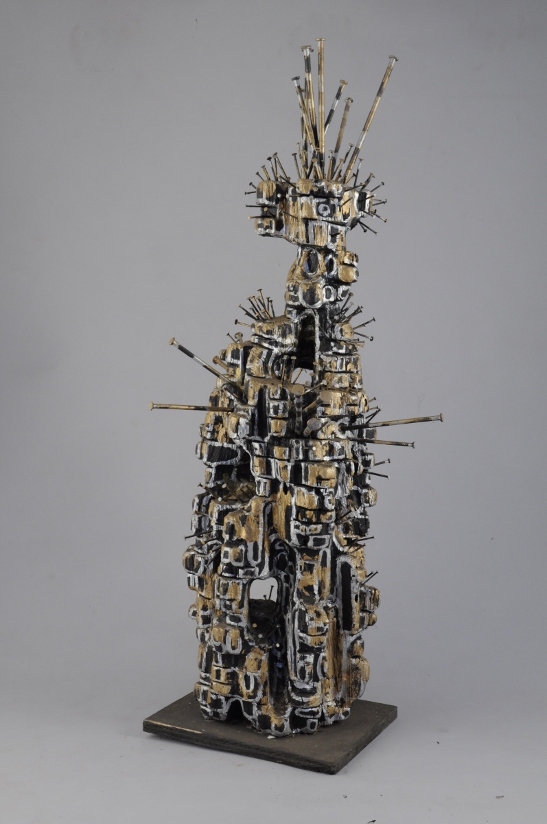 Sculpture en bois brûlé, clous, peinture dorée et argentée