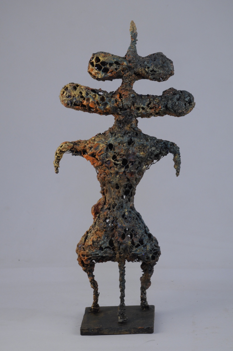 Sculpture en grillage, plastique fondu, incrustations, peinture sur socle de bois