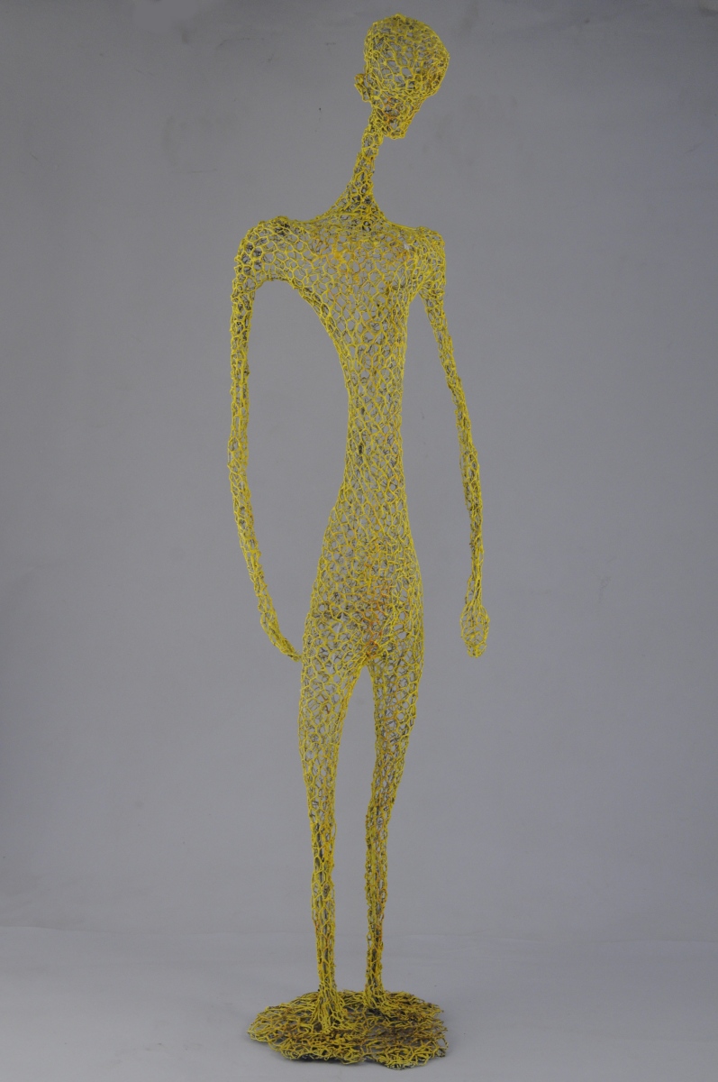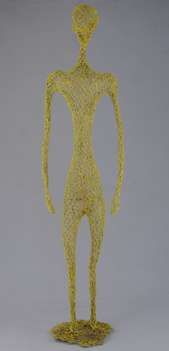 Sculpture en grillage peint en blanc, repeint en jaune, traces de peinture rouge