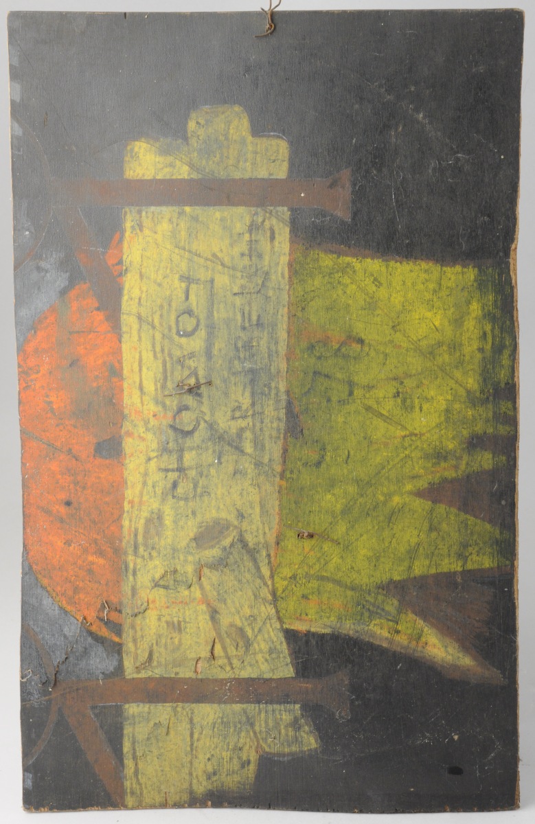 Sculpture en plastique fondu et incrustations diverses sur bois, signée au dos, légendée " ar-préludien " et datée 78