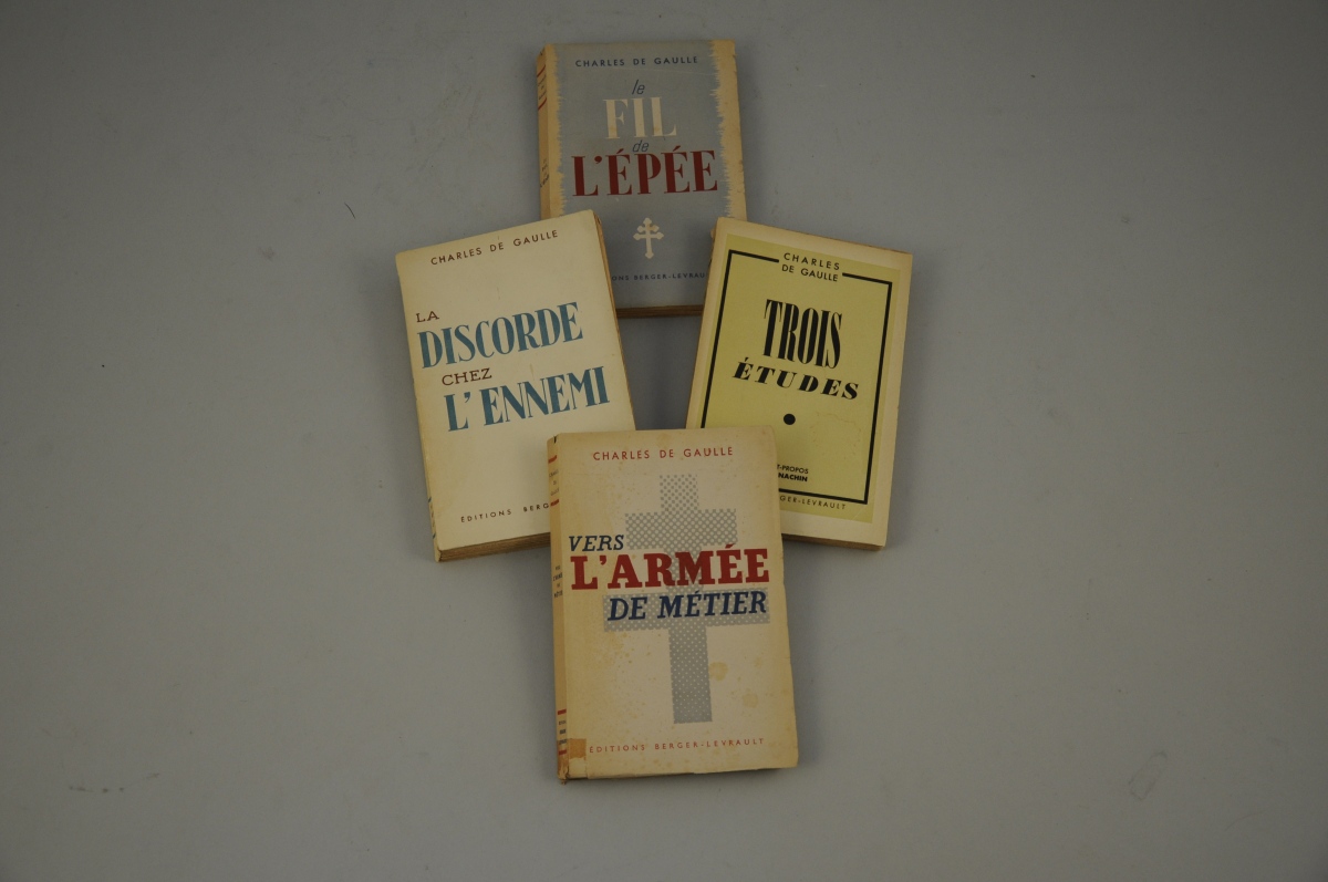 Charles de GAULLE, "La discorde chez l'ennemi", éd. Berger-Levrault, 1944 ; "Le fil de l'épée", éd. Berger-Levrault, 1944 ; "Vers l'armée de métier", éd. Berger-Levrault, 1944 ; "Trois études", éd. Berger-Levrault, 1945.