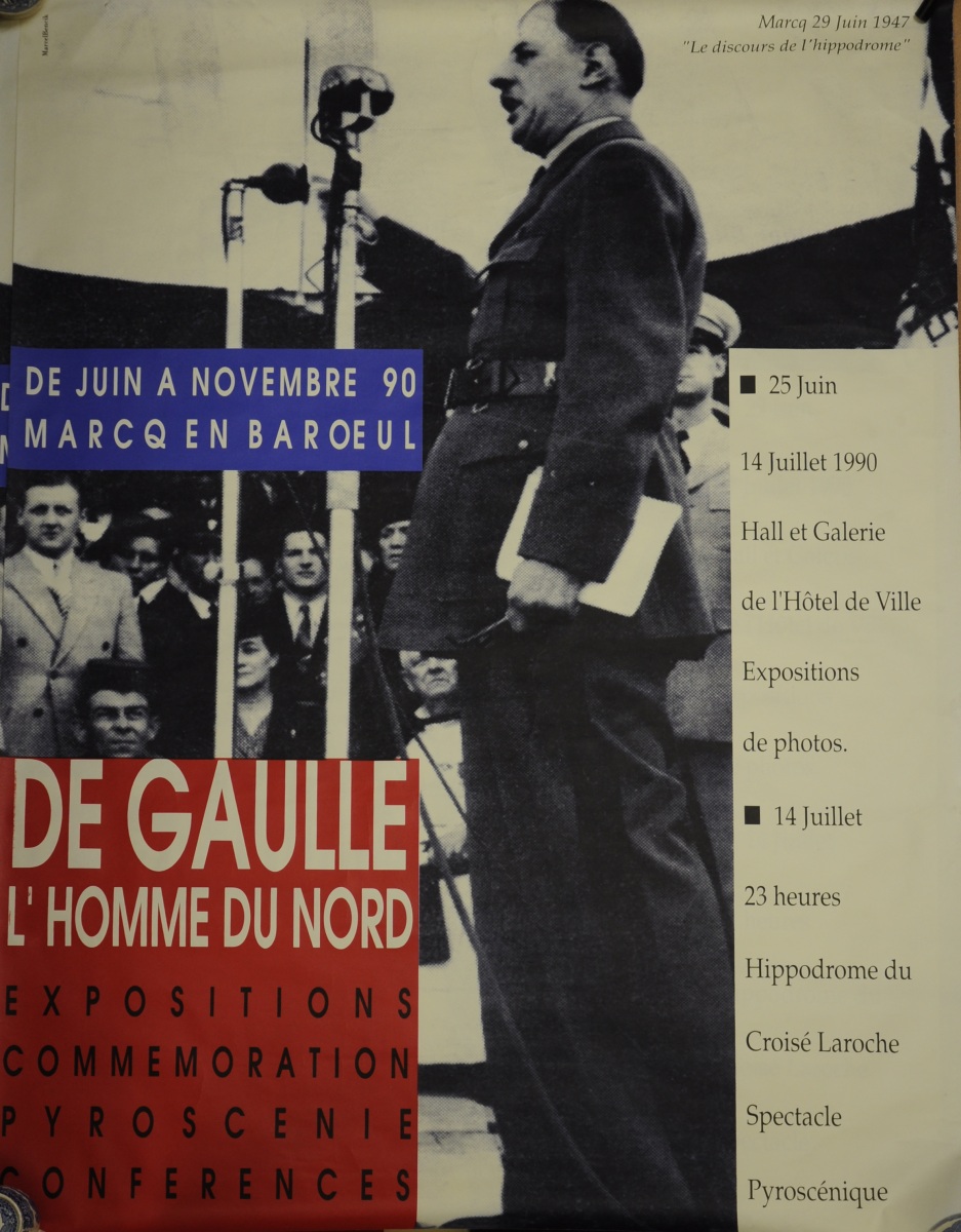 Deux AFFICHES "DE GAULLE L'HOMME DU NORD", commémoration du "Discours de l'hyppodrome" du 29 juin 1947, Hôtel de Ville de Marcq en Baroeul, 14 juillet 1990 . 174 x 120 cm.