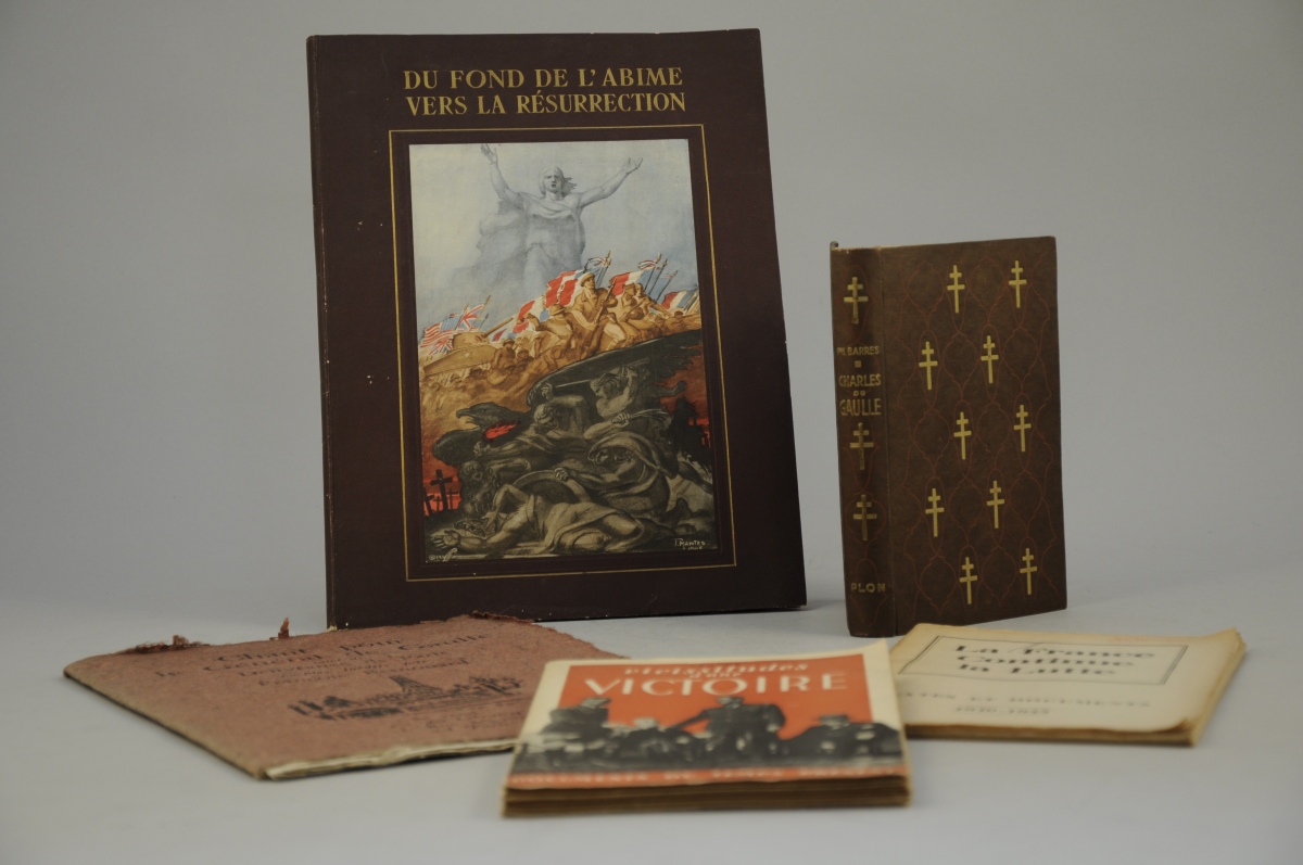OUVRAGES DE GUERRE: "La France continue la lutte texte et documents 1940-1943", brochure. François BERNOUARD, "Chant pour le Général de Gaulle suivi de Délivrande de Paris", Cie des Libraires, 1944. Philippe BARRÈS, "Charles de Gaulle", Libraire Plon, Paris, 1944. CRUSOE, "Vicissitudes d'une victoire", éd. de l'Âme Française, 1946. "Du fond de l'Abîme vers la Résurrection", éd. MD, 1946 (recueil de facsimilés).