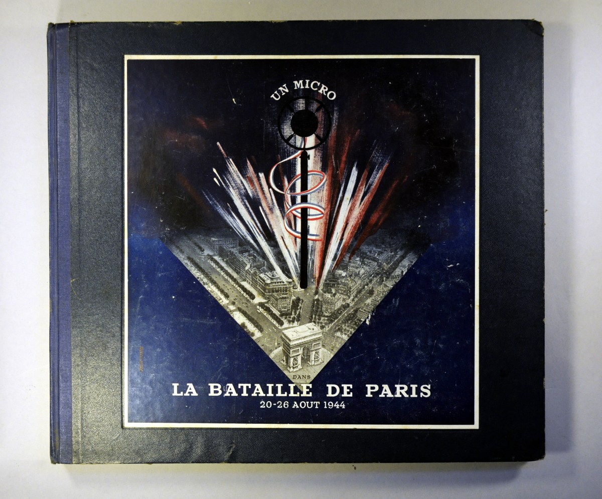 "UN MICRO DANS LA BATAILLE DE PARIS 20-26 AOÛT 1944", quatre disques 78 tours dans un cartonnage illustré par Jean Colin.
