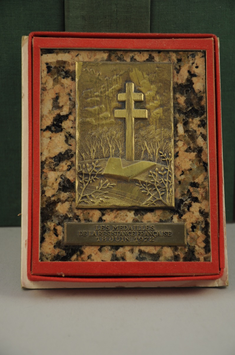 DRAGO. "Les médaillés de la résistance française". Plaque mémorial en bronze dans un encadrement de granit. 1,5 x 9 cm.