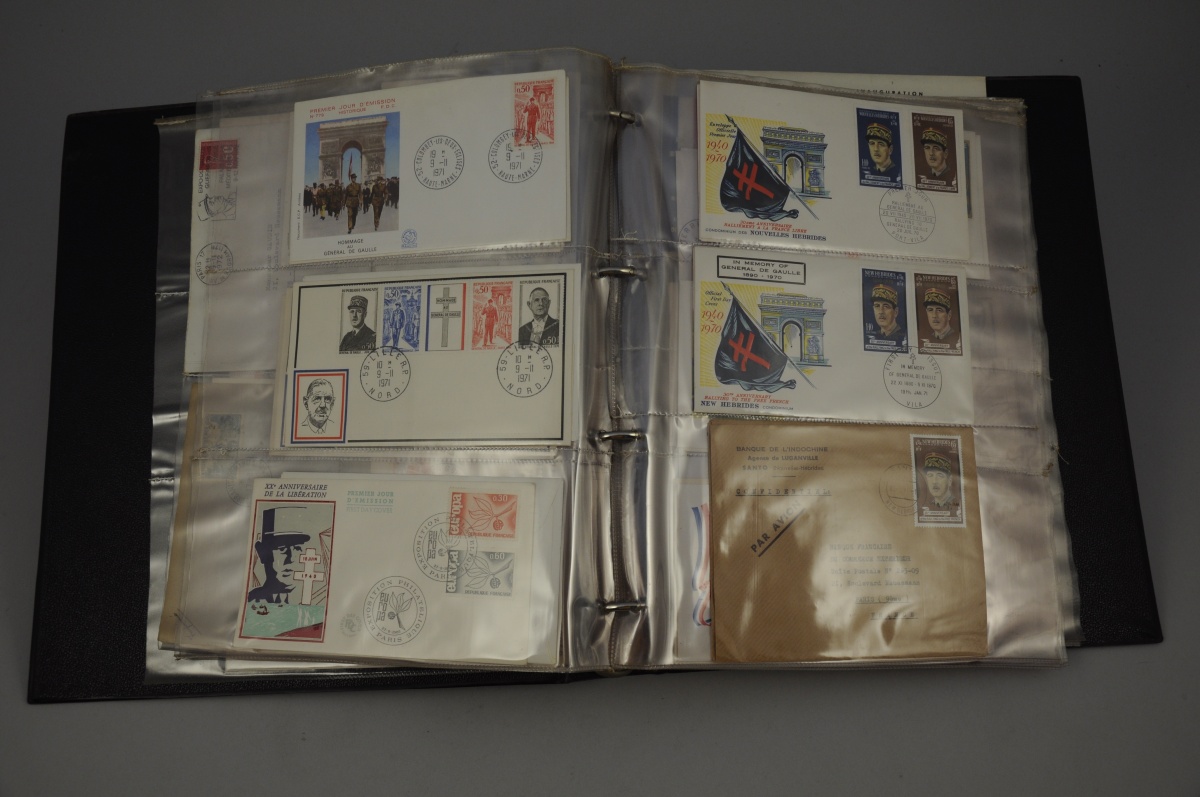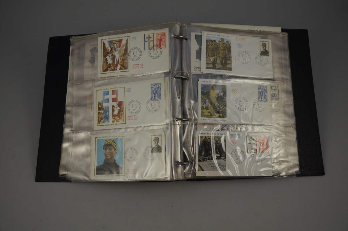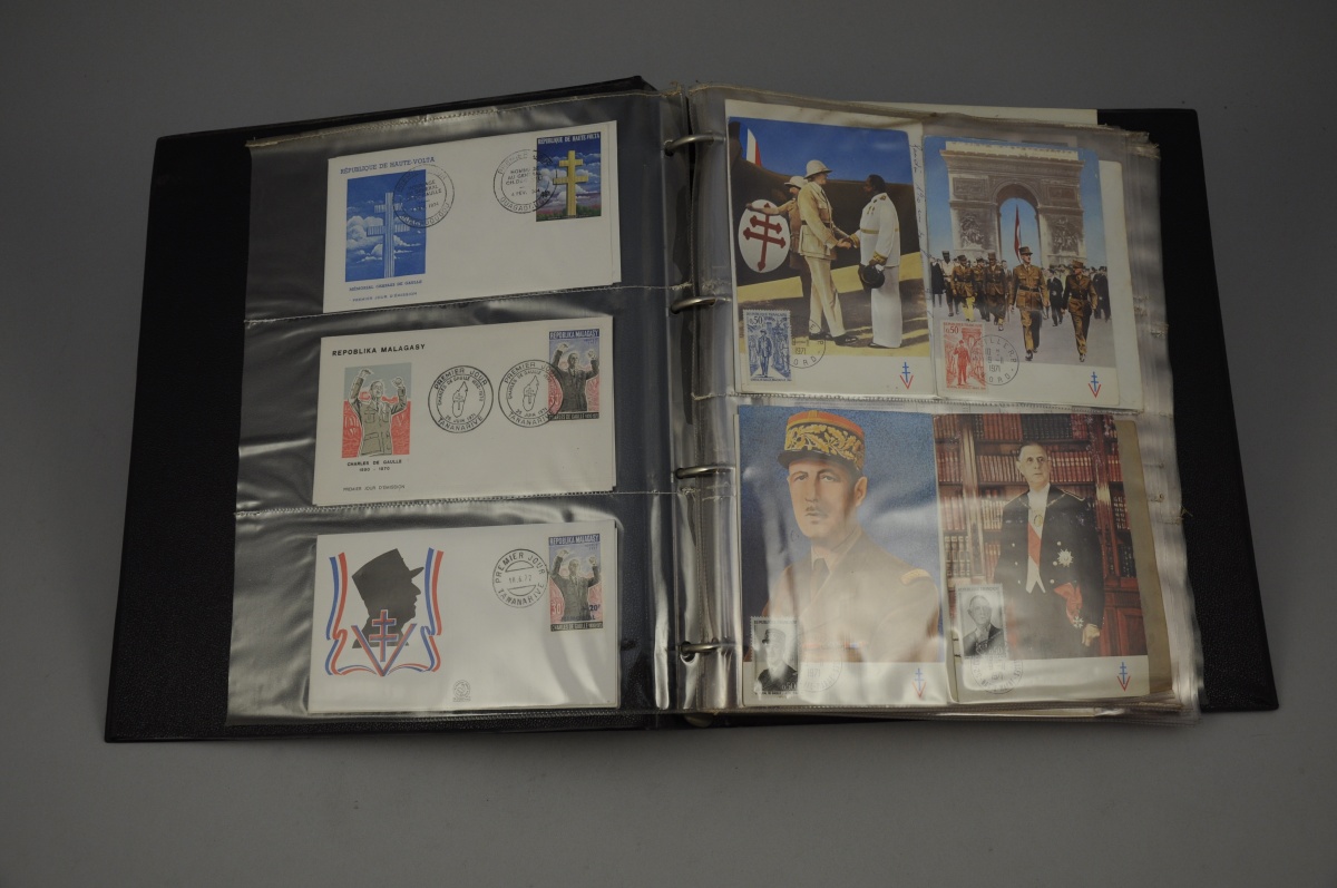 CLASSEUR PHILATÉLIQUE: DE GAULLE. 17 feuillets pochettes comprenant photographies, documents, enveloppe premier jour et des cartes postales.