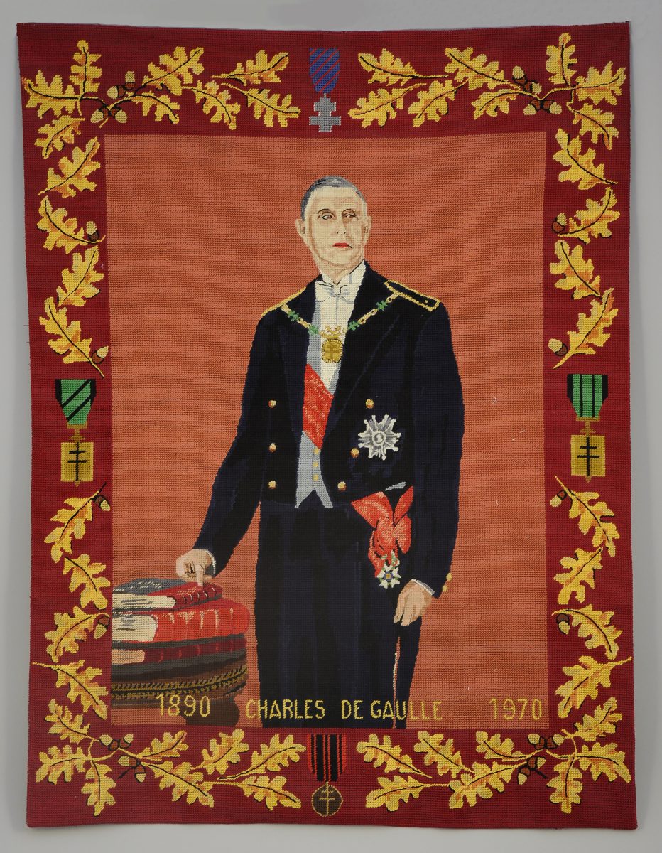 DE GAULLE PRÉSIDENT DE LA RÉPUBLIQUE. CANEVAS au petit point doublé, frise de feuilles de chênes et croix de la Libération. 99 x 74 cm. Pièce unique.