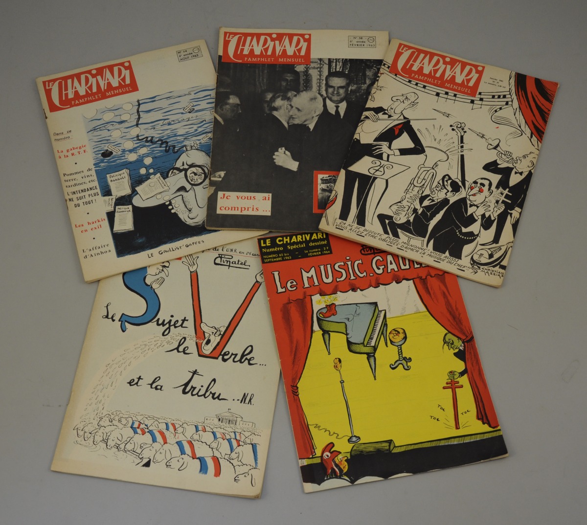 LE CHARIVARI. 5 numéros du journal pamphlétaire mensuel: n°53 bis spécial dessiné "analyse de l'UNR en 25 caricatures", n°57 jan. 1963, n°58 fév. 1963, n°64 août 1963, n°65 bis sept. 1963 spécial dessiné "Le MUSIC-GAULLE".