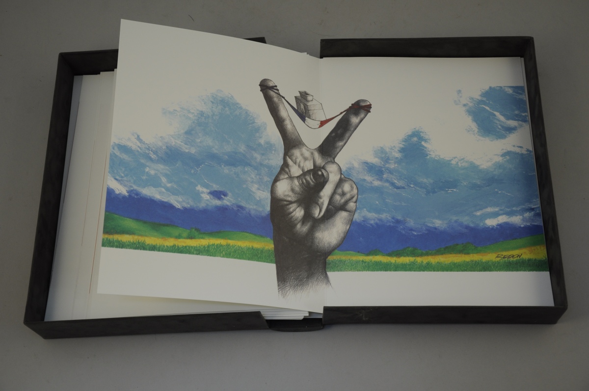 Jacky REDON. "De Gaulle vous regarde". Caricatures et dessins originaux réunis dans un coffret, n°1212/2000, éd. Arts et Lumière, 2002.