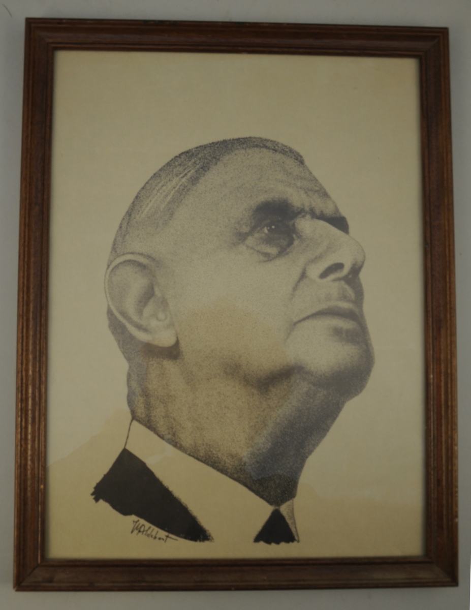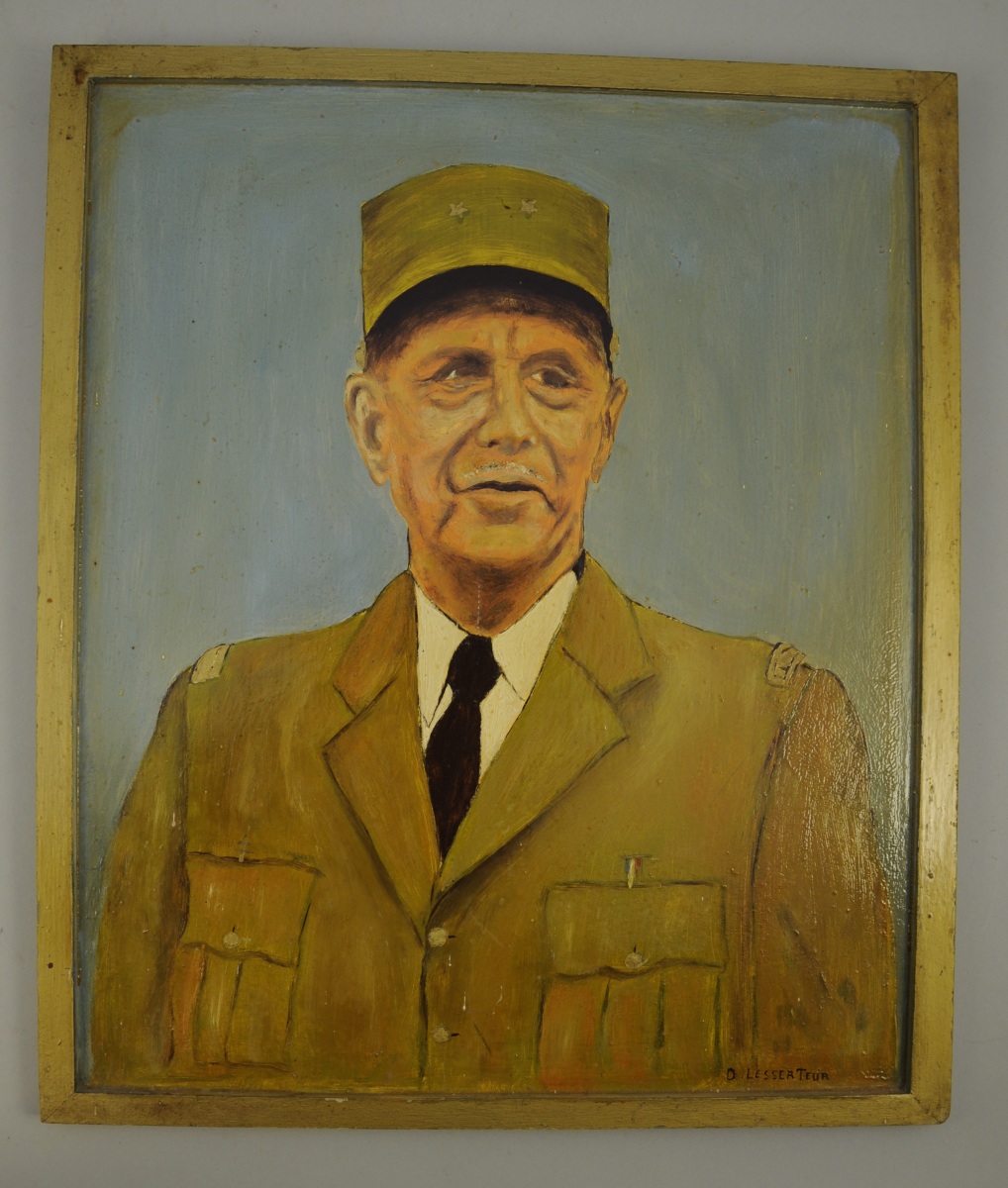 VARIATIONS GAULLIENNES. D. LESSERTEUR. Portrait du Général. Panneau signé. 43 x 37 cm. ALDEBERT. Portrait du Général. Lithographie. 40 x 30 cm.