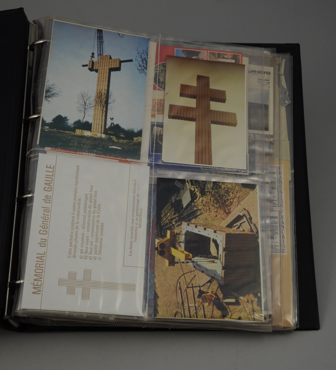CLASSEUR PHILATÉLIQUE: LE MÉMORIAL DE COLOMBEY. 17 pochettes comprenant cartes postales, photographies de Colombey-les-deux-Églises, enveloppes premier jour, etc.