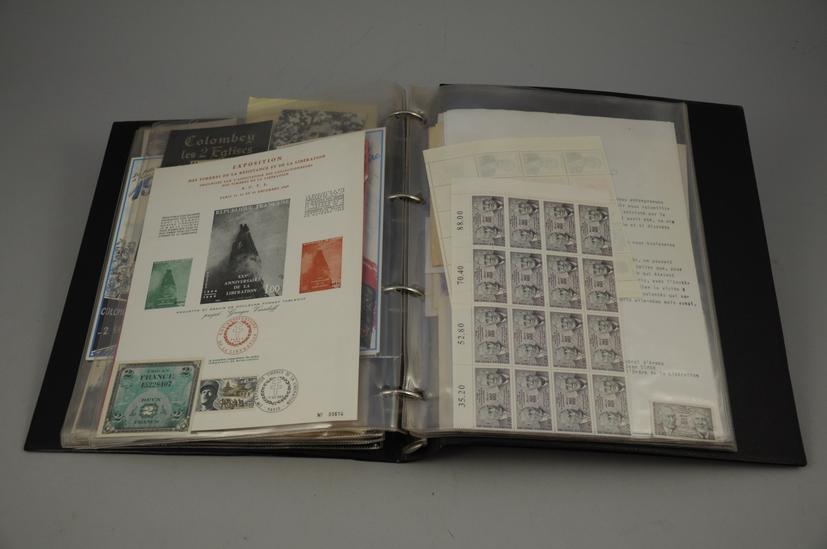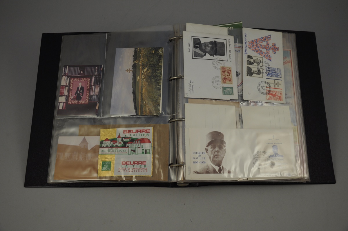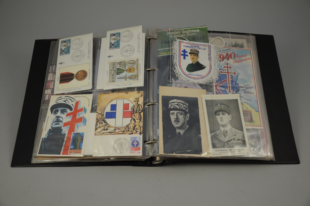 CLASSEUR PHILATÉLIQUE: SOUVENIRS GAULLISTES. 10 pochettes comprenant: cartes postales, photographies de Colombey-les-deux-Églises, timbres, enveloppes premier jour, documents anecdotiques, etc.