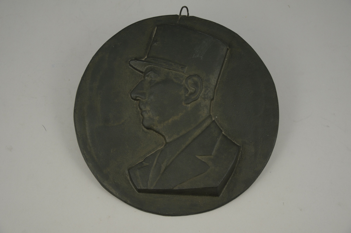 MÉDAILLON DU GÉNÉRAL DE GAULLE coiffé de son képi en fonte à patine verte. Souvenir commémoratif vendu à Colombey-les-deux- Églises. Fonte à patine verte. Diam 29 cm.