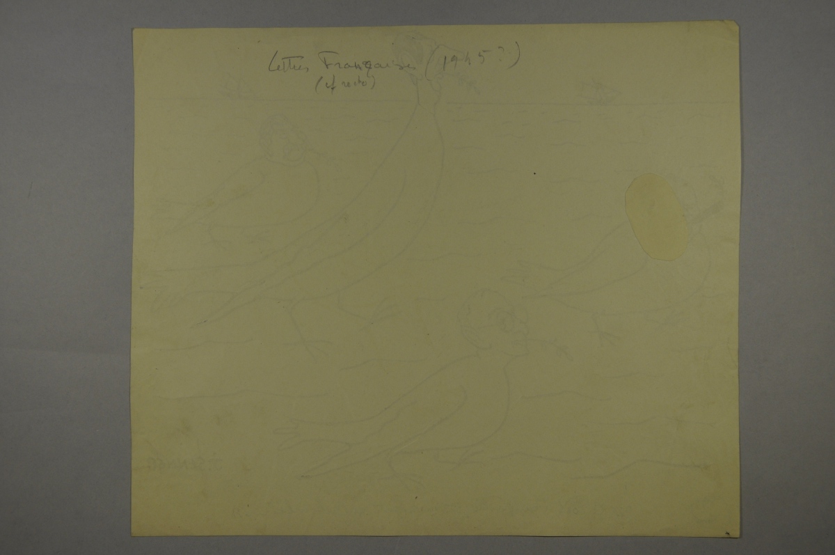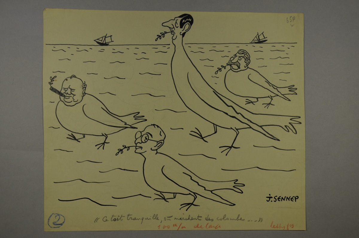 SENNEP. "Ce toit tranquille, où marchent des colombes..." de Gaulle, Staline, Churchill...Dessin original à l'encre, pour les Lettres Françaises, 1945? Signé et titré. 24 x 28,5 cm.