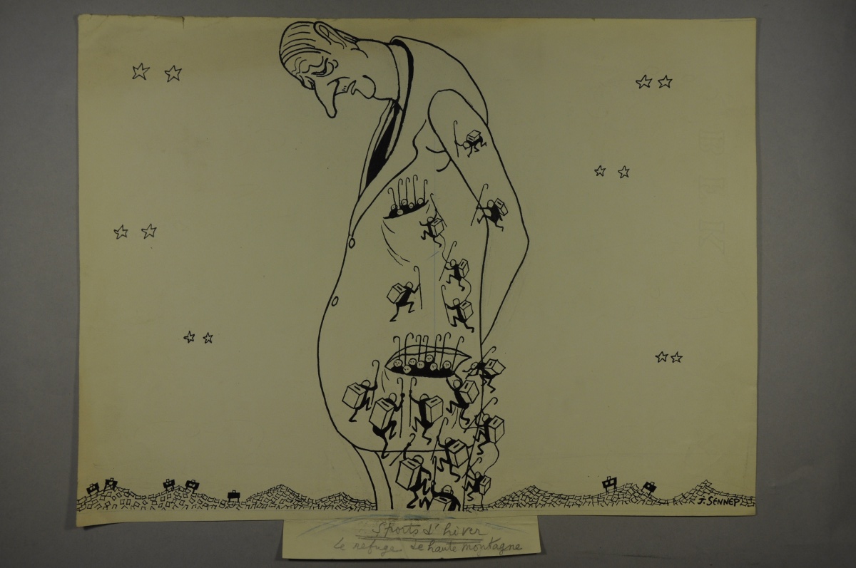SENNEP. "Sports d'hiver - Le refuge de haute montagne". de Gaulle. Dessin original à l'encre, pour le Figaro du 14 novembre 1958, élections législatives des 23/29 novembre. Signé et titré. 28 x 37,5 cm.