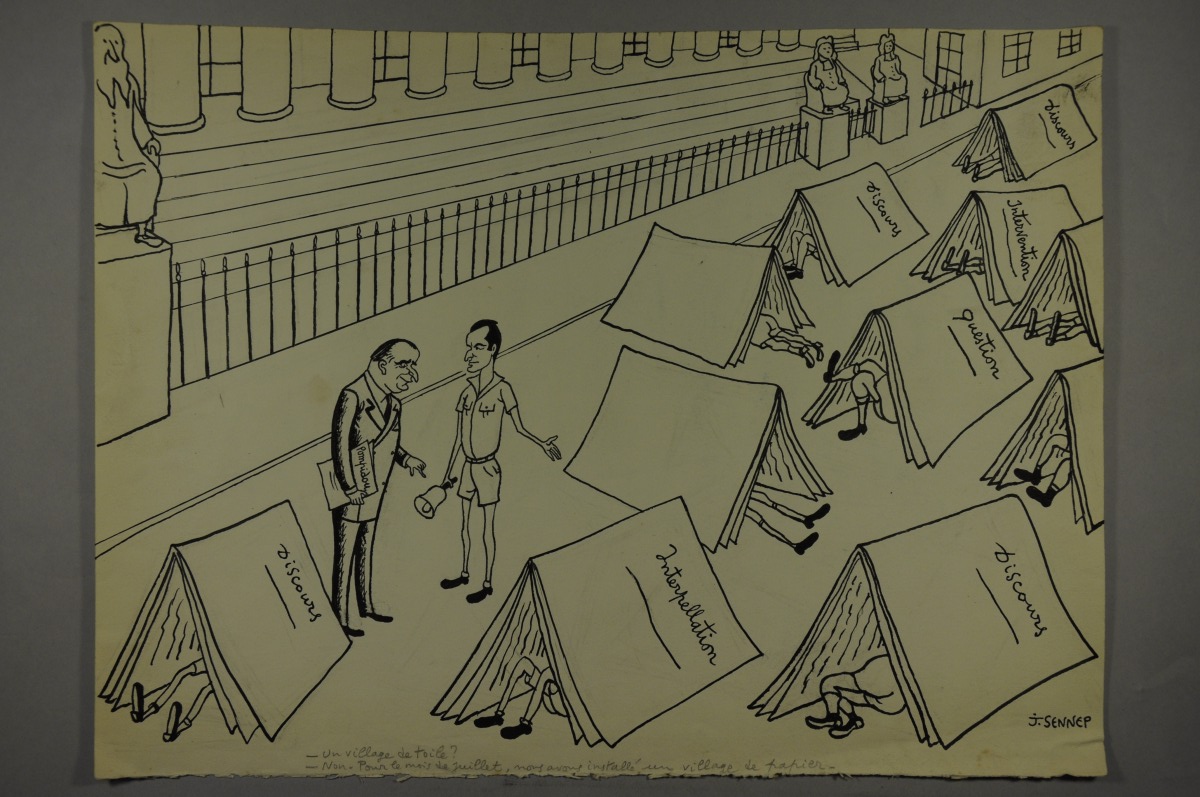 SENNEP. "Un village de toile? - Non. Pour le mois de juillet, nous avons installé un village de papier." Interpellation, discours... Pompidou et Chaban Delmas. Dessin original à l'encre pour le Figaro du 4 juillet 1962. Signé et légendé. 27,5 x 37 cm.