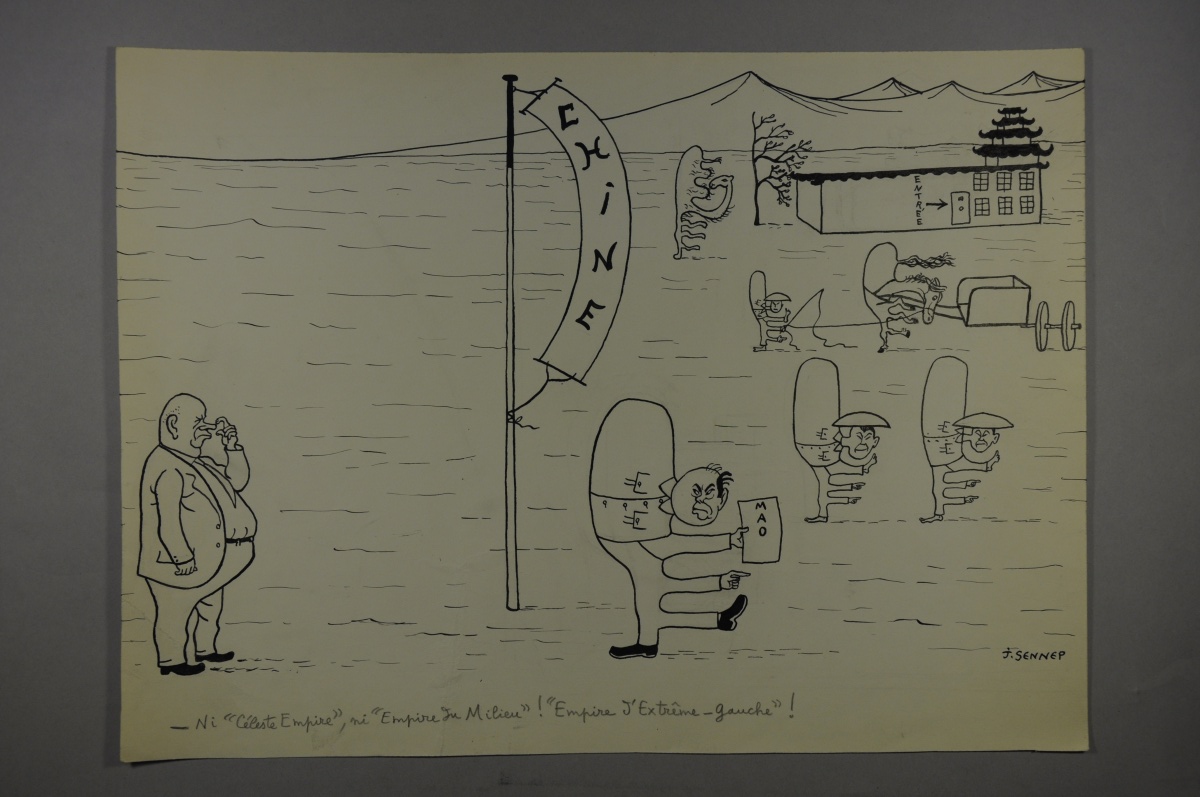 SENNEP. "Chine - Ni "Céleste Empire", ni "Empire du Milieu"! "Empire d'Extrême -Gauche!" Mao... Dessin original à l'encre pour le Figaro du 27 juin 1963. Signé et légendé. 26 x 36 cm.