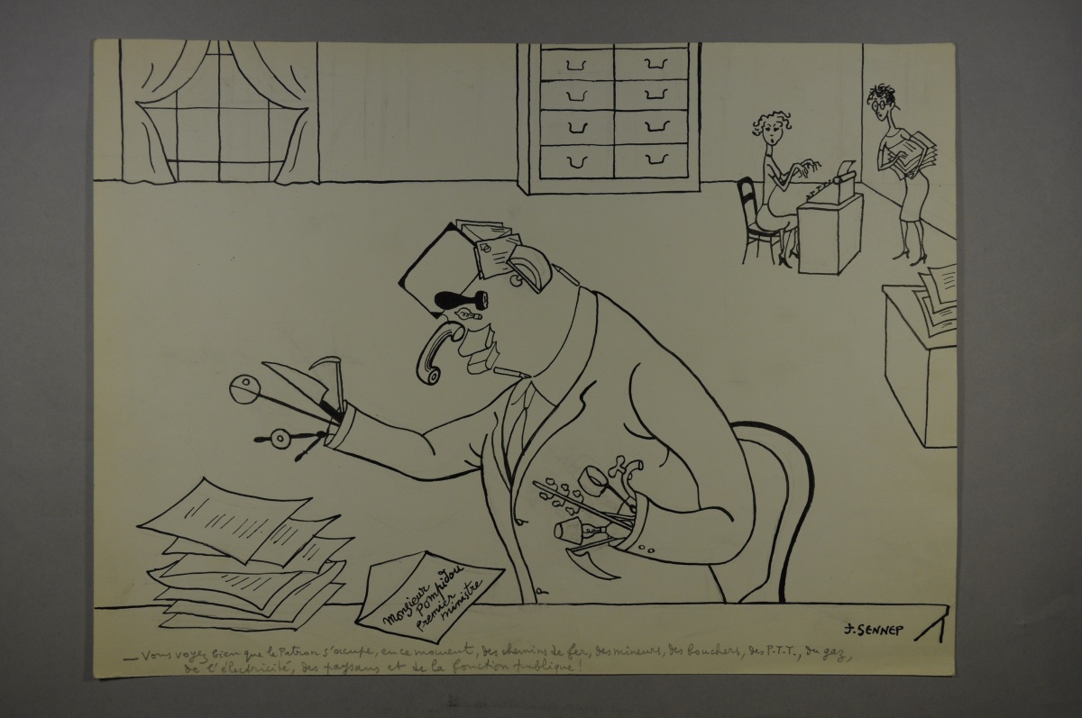 SENNEP. "- Vous voyez bien que le Patron s'occupe en ce moment, des chemins de fer, des mineurs, des bouchers, des P.T.T., du gaz, de l'électricité, des paysans et de la fonction publique!", Monsieur Pompidou Premier Ministre. Dessin original à l'encre pour le Figaro du 25 octobre 1963. Signé et légendé. 26,5 x 35,5 cm.