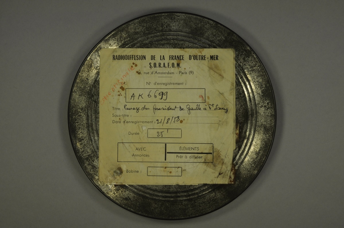 PASSAGE DU PRÉSIDENT DE GAULLE À FORT LAMY, 21 VIII 1958. Copie originale de l'enregistrement de la Radiodiffusion de la France d'Outre-Mer (S.O.R.A.F.O.M.), d'une durée de 25 minutes, n°AK6699. Joint la copie K7 de l'enregistrement.