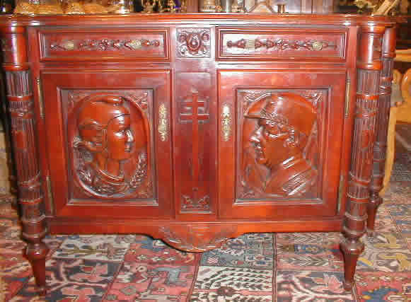 BUFFET BAS en bois teinté acajou mouluré et sculpté au Général de Gaulle.