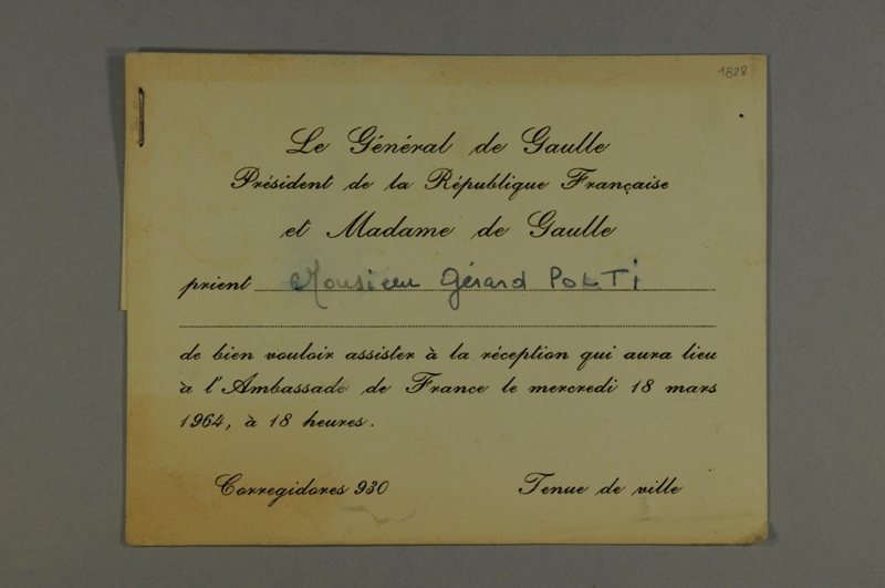 CARTON D'INVITATION pour une réception à l'Ambassade de France en Espagne: "Le Général de Gaulle Président de la République Française et Madame de Gaulle prient Monsieur Gérard POLTI de bien vouloir assister à la réception qui aura lieu à l'Ambassade de France le mercredi 18 mars 1964, à 18 heures. Corregidores 930. Tenue de Ville." Plan au dos.