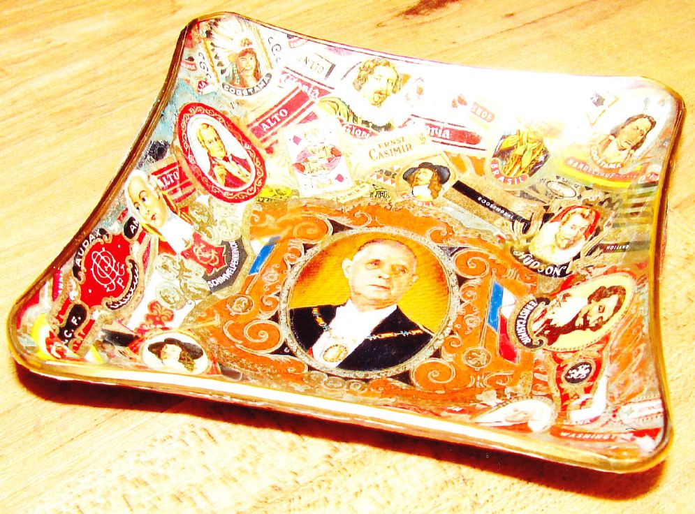 CENDRIER rectangulaire en verre à l'effigie du Général de Gaulle, Président de la République Française, dans un entourage de figures publicitaires provenant de bagues de cigares. Travail anglais. 14 x 13 cm.