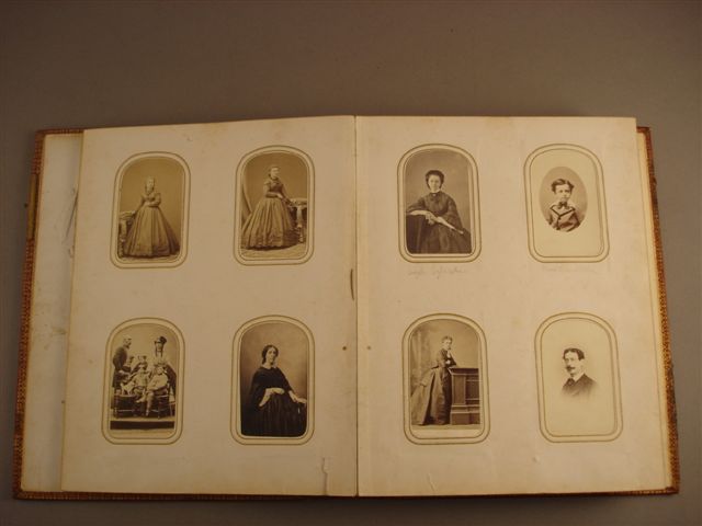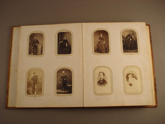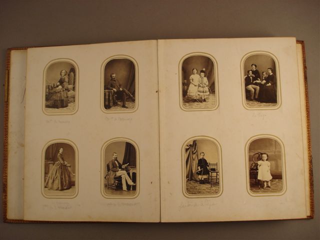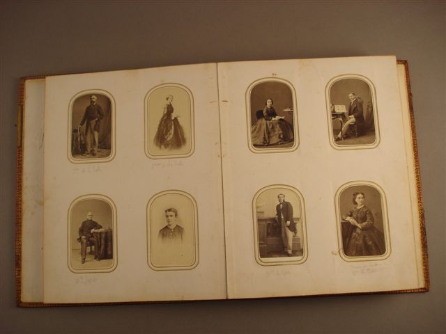 ALBUM DE 185 PHOTOGRAPHIES ANCIENNES (Guillaume d'Etchegoyen, Maurice d'Etchegoyen, Frédéric d'Etchegoyen, le Shah de Perse, le général Bugeaud). Format in 4°. Chagrin rouge décoré en relief et tranches dorées. (accident et déchirure).