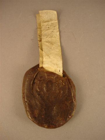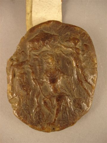 CACHET en cire représentant le roi de France, assis sous un dais, muni des Regalia et sur le revers les armes de la Maison de France. Fragments de vélin.
