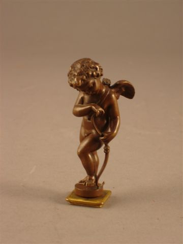 ANGELOT ailé en bronze à patine brune. Repose sur un petit socle carré monogrammé "AS" au revers. Signé "F. BARBEDIENNE".