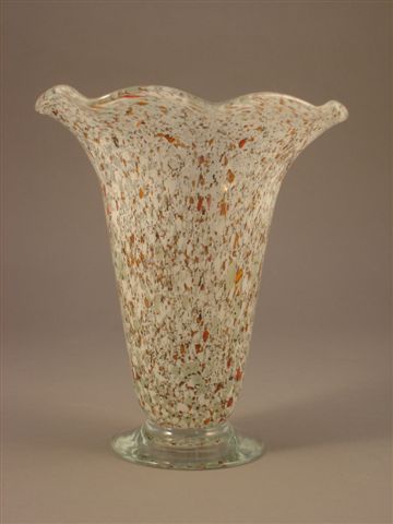 VASE cornet en verre soufflé moulé sur fond marbré orange, blanc et gris. Col ondulant. Base circulaire.